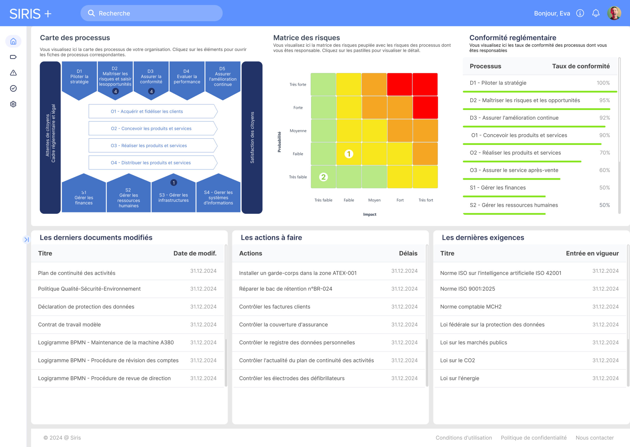 SIRIS+ Solution de gouvernance intégrée Processus Risques Compliance Qualité Sécurité Environnement avec système d’aide à la veille réglementaire multinational.